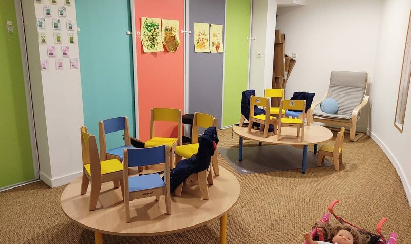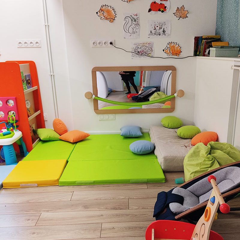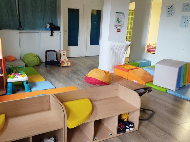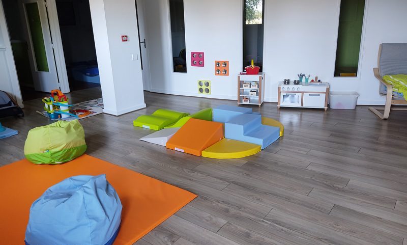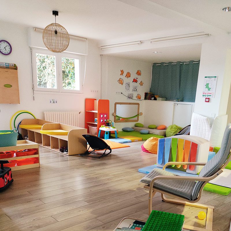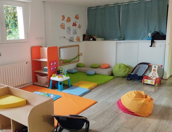 - 1 pièce de vie de plus de 50m² avec plusieurs espaces dans lesquels l’enfant peut évoluer en toute liberté sous l’œil bienveillant de l’équipe pédagogique. Des espaces dédiés à la lecture, à la motricité (un parcours de motricité en mousse pour pouvoir s’entraîner à devenir grand), aux jeux d’imitation(dînette, voiture…) et bien sûr un coin bébé…